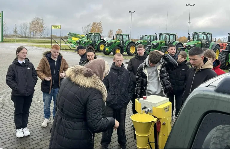 Vilkaviškio skyriaus tiksliosios žemdirbystės mokiniai kartu su profesijos mokytoja Brigita Sidariene ir grupės vadove bei anglų kalbos mokytoja Angele Ignatavičiene lankėsi prekybos ir aptarnavimo centre „DOJUS agro“.